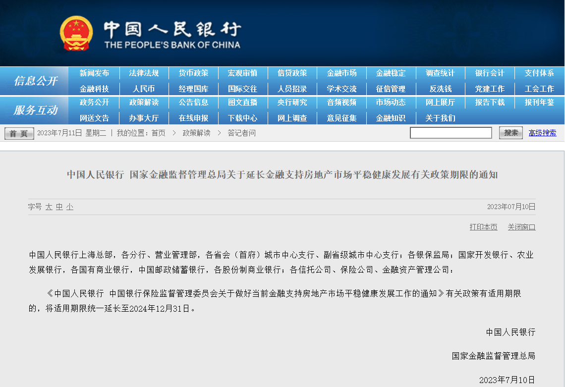 央廣網(wǎng)北京7月11日消息 據(jù)中國(guó)人民銀行網(wǎng)站消息,中國(guó)人民銀行、國(guó)家金融監(jiān)督管理總局7月10日發(fā)布通知,將去年發(fā)布的支持房地產(chǎn)“金融16條”部分政策,適用期限延長(zhǎng)至2024年12月31日。