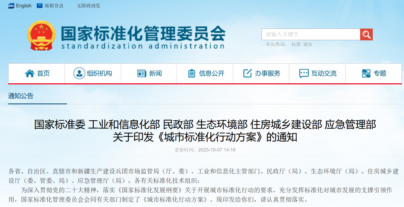 央廣網(wǎng)北京10月8日消息 據(jù)國家標準化管理委員會網(wǎng)站消息,為落實《國家標準化發(fā)展綱要》關(guān)于開展城市標準化行動的要求,充分發(fā)揮標準化對城市發(fā)展的支撐引領作用,近日,國家標準化管理委員會會同工業(yè)和信息化部、民政部、生態(tài)環(huán)境部、住房城鄉(xiāng)建設部、應急管理部制定了《城市標準化行動方案》(以下簡稱《行動方案》)。