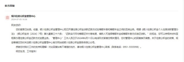 收到留言后,銀川住房公積金管理中心作出公開回復(fù)?;貜?fù)稱:經(jīng)查,銀川住房公積金管理中心現(xiàn)已開通住房公積金貸款還款方式在等額本息和等額本金之間的互轉(zhuǎn)業(yè)務(wù)。網(wǎng)友可以持相關(guān)材料至柜面辦理住房公積金還款方式變更業(yè)務(wù)。