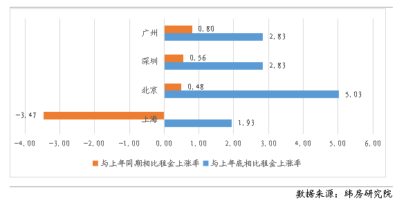 與上年底相比,一線城市住房租金均上漲,且除上海外均高于去年同期水平。從漲幅來看,北京上半年住房租金上漲最快,漲幅為5.03%;其次是廣州和深圳,上半年住房租金漲幅均為2.83%;上海漲幅最小,也達到1.93%。 與去年同期相比,一線城市住房租金以微漲為主,其中廣州住房租金上漲0.80%,深圳上漲0.56%,北京上漲0.48%,但上海下降3.47%。 圖10 一線城市住房租金變動情況(%)