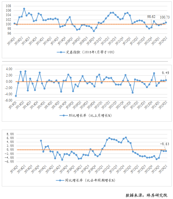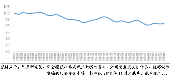 同樣,貝殼研究院數(shù)據(jù)顯示上半年租金成交價保持相對平穩(wěn),不過仍略低于去年同期。從租金成交價水平來看,2023年上半年重點40城月租金水平為36.6元/平米,比去年上半年下跌1.2%;套均月租金為2896.3元/套,與去年同期基本持平。雖然住房租賃市場活躍度較高,但隨著住房租賃市場個人業(yè)主房源、住房租賃企業(yè)房源供應(yīng)量的持續(xù)增加,租金成交價水平整體低于上年同期。從成交價月度租金指數(shù)來看,除4月外,其余月份租金指數(shù)均環(huán)比穩(wěn)中微漲。不過與上年同月相比,上半年各月租金同比仍下跌,跌幅在1.0%-2.4%之間。 圖2 重點40城租金指數(shù)