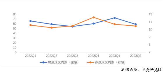 4.房源成交周期先升后降,租客租房難度降低 房客源活躍度提升,房屋出租周期先升后降。根據(jù)貝殼研究院數(shù)據(jù),2023年上半年重點40城新增掛牌房源量、新增帶看客戶量同比、環(huán)比均增加超過9%。房源端、客源端活躍度均保持上升的趨勢。2023年上半年重點40城房客源成交周期分別為65.0天、10.5天。相比于去年,今年上半年房源成交周期總體有所延長。從季度來看,房源供應(yīng)量的增加同時使得2023年一季度房屋出租周期比2022年四季度上升12.1天,但2023年二季度房源成交周期比一季度縮短13.6天,出房速度有所加快。從客源端來看,一、二季度客源成交周期連續(xù)縮短,顯示出租客的租房難度在降低,可選擇房源量較多,有利于租客選擇匹配自身需求的房源。 圖4 重點40城新增掛牌量、新增帶看客戶量走勢