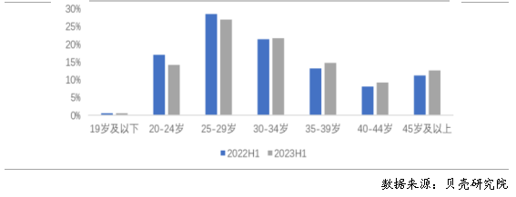 5. 租客:租客年齡有所增長,30歲以上租客占比提升 25-34歲租客仍是主力群體,大齡租客人群占比同比增加顯著。根據(jù)貝殼研究院數(shù)據(jù),2023年上半年重點40城租賃成交中,25-29歲租客占比最高,達到26.9%,其次為30-34歲租客群體,兩者累計占比近5成。對比去年上半年,30歲以上租客群體占比增加4.5個百分點。租客停留在租賃市場的時間延長,未婚租客陸續(xù)步入婚姻生活,市場上家庭型租客增加??紤]到老人和小孩的居住需求,家庭型租客對于大戶型房屋的租賃需求較強,整體租賃需求呈現(xiàn)多元化趨勢。 圖6 2022年上半年、2023年上半年重點40城租客年齡結(jié)構(gòu)分布
