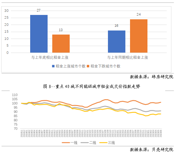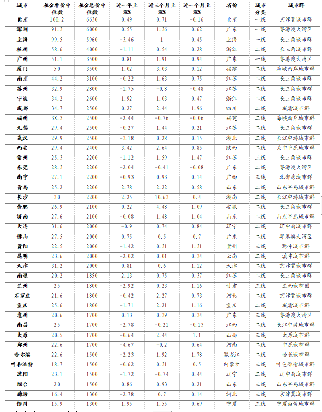 (二)不同城市表現(xiàn):一線城市市場升溫相對更快 分城市來看,上半年多數(shù)城市住房租賃市場活躍度同比提高,但租金還未回升至去年同期水平。 從成交量來看,重點40城中,35個城市同比、環(huán)比均呈現(xiàn)升溫趨勢。根據(jù)貝殼研究院數(shù)據(jù),2023年上半年除北京、煙臺住房租賃成交量環(huán)比減少且幅度不超過4%外,其余38個城市租賃成交量均環(huán)比增加,且多數(shù)城市環(huán)比增幅超過10%。從同比來看,上半年北京、成都、寧波、石家莊、武漢租賃成交量同比減少,其余35個城市租賃成交量均同比增加,同比增幅最高的前10個城市多為長三角地區(qū)、東南沿海地區(qū)的城市。 從租金水平來看,緯房研究院數(shù)據(jù)顯示,與上年末相比,上半年重點40城中27個城市住房租金小幅上漲,13個城市住房租金下跌。與2022年上半年相比,16個城市住房租金上漲,24個城市住房租金下降。根據(jù)貝殼研究院數(shù)據(jù),分不同能級城市租金指數(shù)來看,各能級城市各月租金指數(shù)均同比下跌,一線城市同比跌幅較小,各月同比跌幅在0.1%-1.5%之間。 圖7 重點40城租金漲跌情況