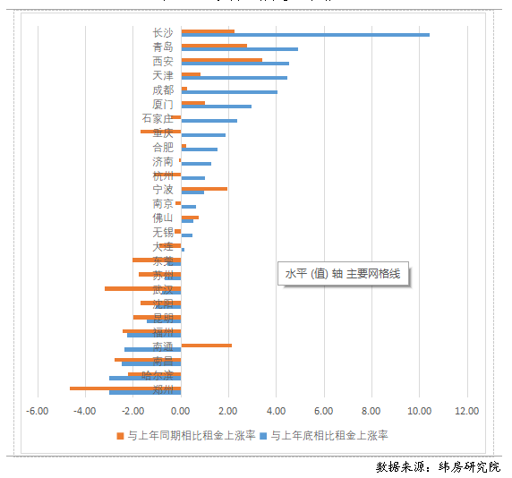 二線城市上半年住房租金漲跌參半,但多數(shù)城市未達到去年同期水平。與上年末相比,住房大數(shù)據(jù)監(jiān)測的26個二線城市中,有10個城市住房租金下降,16個城市住房租金上漲。其中,鄭州、哈爾濱、南昌等城市的住房租金降幅最大;長沙、青島、西安、天津、成都等城市漲幅在4%以上。 與2022年同期相比,住房大數(shù)據(jù)監(jiān)測的26個二線城市中,有16個城市住房租金下降,10個城市住房租金上漲。其中,鄭州、武漢、南昌等城市上半年住房租金跌幅最大,分別下跌4.67%、3.18%和2.77%;西安、青島、長沙等城市上半年住房租金同比漲幅最大,分別上漲3.42%、2.78%和2.25%。 圖11 二線城市住房租金變動情況(%)