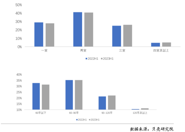 3.中小戶型需求旺盛,兩居室成交占比最高 上半年租賃成交中兩居室、60-90平米房源占比最高。根據(jù)貝殼研究院數(shù)據(jù),2023年上半年重點40城兩居室成交占比最高,占比40.8%,其次為一居室,占比27.9%;租賃成交中面積段為60-90平米的占比達到35.2%,其次為60平米以下,占比為31.5%。對比去年同期,2023年上半年租賃成交結(jié)構(gòu)相對穩(wěn)定,租客對于一居室、兩居室的小戶型租賃房源需求仍保持旺盛。一居室或60平米以下的占比略有減少,部分對一居室有需求的租客或轉(zhuǎn)向了租賃集中式長租公寓,尤其是保障性租賃住房。 圖3 2022年上半年、2023年上半年重點40城租賃成交結(jié)構(gòu)分布