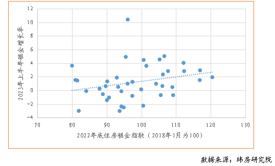 住房租金漲幅呈現(xiàn)分化態(tài)勢,表現(xiàn)出“快者恒快、慢者恒慢”的現(xiàn)象。過去四年住房租金漲幅快的城市,2023上半年漲幅依然相對較快;而過去四年住房租金漲幅相對較慢的城市,2023上半年漲幅依然相對較慢。 圖9 2023年上半年重點40城住房租金增長率與2022年底住房租金指數(shù)關(guān)系
