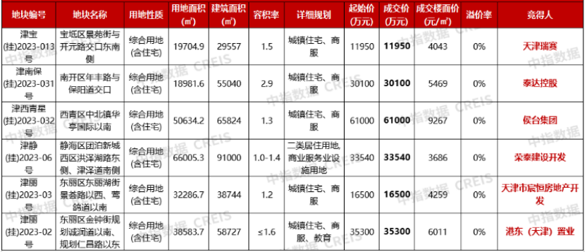 此外,津靜(掛)2023-06號地塊位于靜海區(qū)團(tuán)泊新城西區(qū)洪澤湖路東側(cè)、津澤道南側(cè),由天津市榮泰建設(shè)開發(fā)有限公司底價(jià)3.354億摘得,樓面價(jià)3686元/㎡。津南保(掛)2023-031號地塊位于南開區(qū)年豐路與保陽道交口,為南開天拖城市更新地塊,由泰達(dá)控股起始價(jià)3.01億元摘得,樓面價(jià)5469元/㎡。津?qū)?掛)2023-013號地塊位于寶坻區(qū)幸福路與景苑街交口西南角,由天津瑞賽起始價(jià)1.195億元摘得,樓面價(jià)4043元/㎡。
