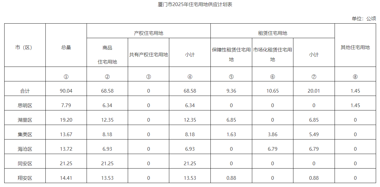 從住宅用地總量和結構來看,2025年廈門市住宅用地計劃供應90公頃,其中產權住宅用地69公頃(商品住宅用地69公頃,共有產權住宅用地0公頃),租賃住宅用地20公頃(保障性租賃住宅用地9公頃,市場化租賃住宅用地11公頃),其他住宅用地(拆遷安置房)1公頃。