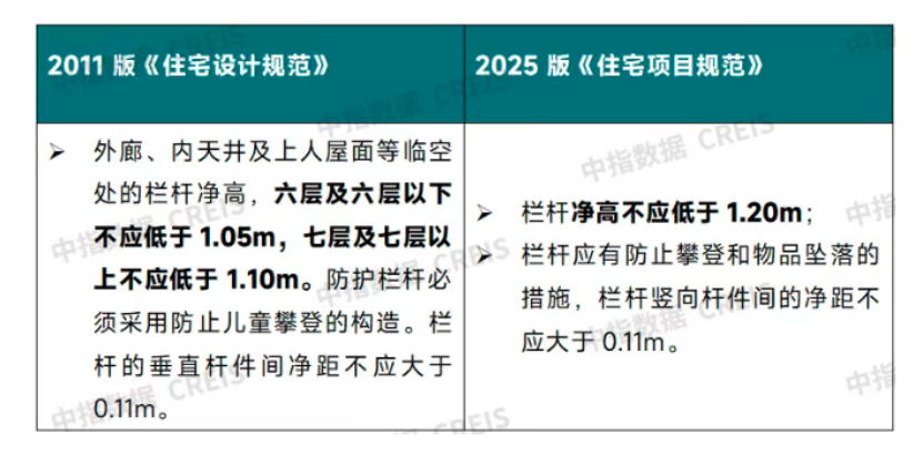 2011版《住宅設(shè)計規(guī)范》按住宅層數(shù)對陽臺欄桿高度提出了不同要求,2022版《住宅項目規(guī)范》(征求意見稿)將陽臺欄桿高度統(tǒng)一調(diào)整為1.1米,2025版新規(guī)再次將這一標準提高至1.2米。