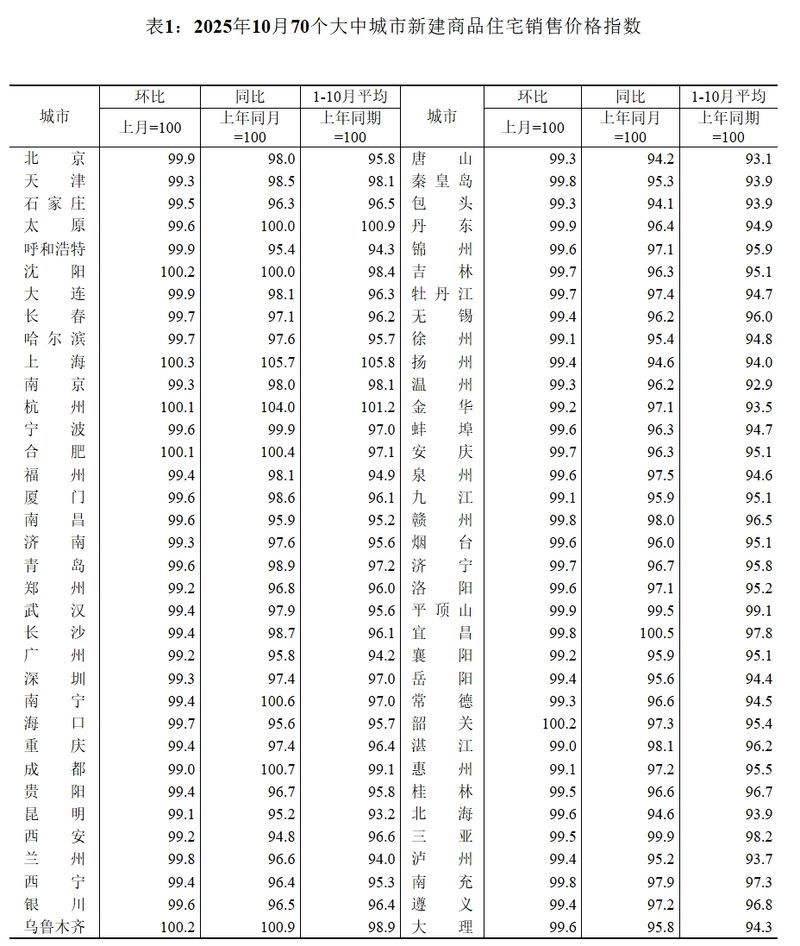 據(jù)國(guó)家統(tǒng)計(jì)局?jǐn)?shù)據(jù),10月份,一線城市新建商品住宅銷售價(jià)格環(huán)比下降0.3%,降幅與上月相同。其中,上海上漲0.3%,北京、廣州和深圳分別下降0.1%、0.8%和0.7%。二線城市新建商品住宅銷售價(jià)格環(huán)比下降0.4%,降幅與上月相同。三線城市新建商品住宅銷售價(jià)格環(huán)比下降0.5%,降幅擴(kuò)大0.1個(gè)百分點(diǎn)。
