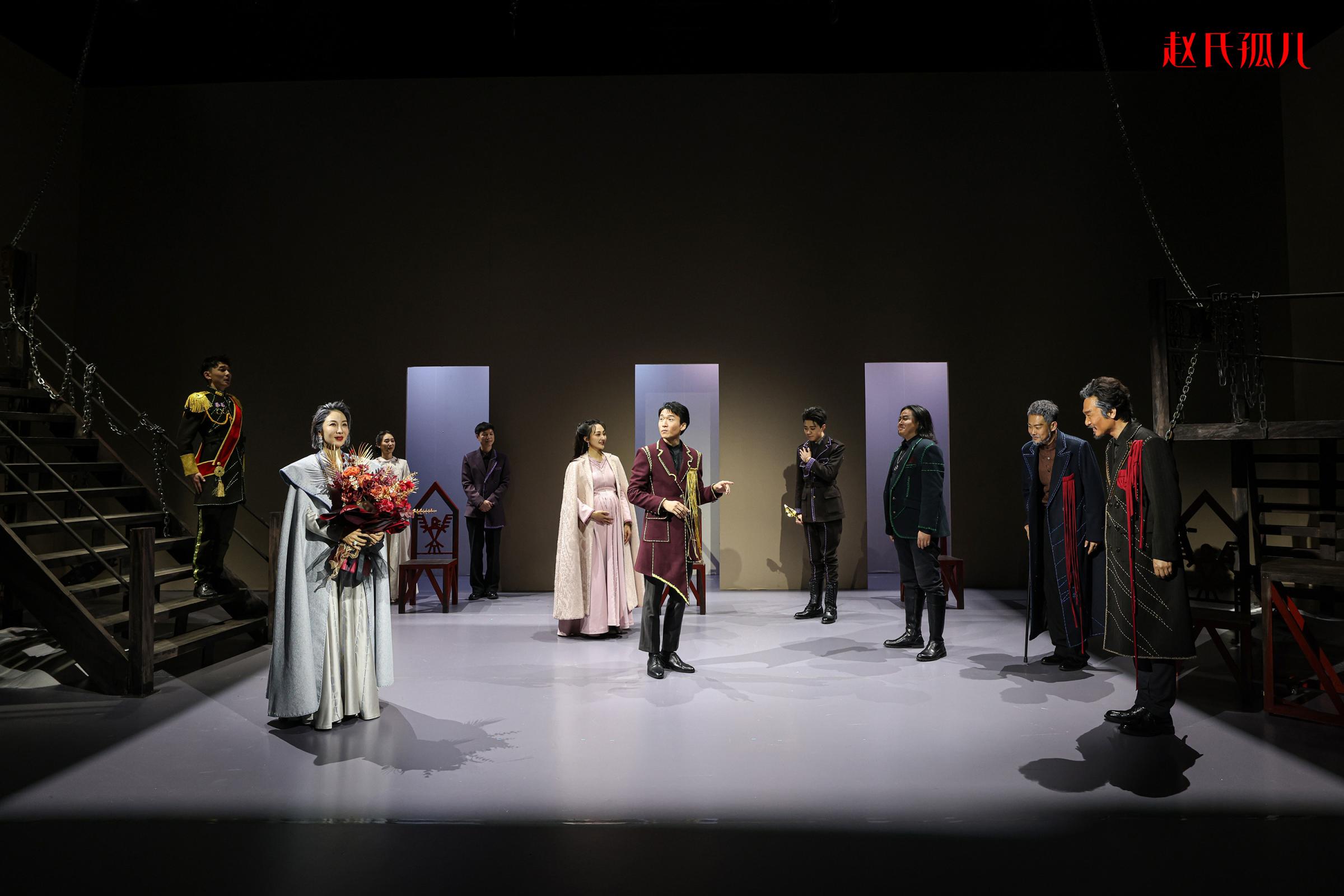 整部作品的敘事風(fēng)格相當(dāng)獨(dú)特,劇中場(chǎng)景眾多,幕與幕之間沒(méi)有傳統(tǒng)的起承轉(zhuǎn)合,而是以片段的形式迅速切換,快速且激烈地展現(xiàn)了相當(dāng)復(fù)雜的角色關(guān)系和劇情發(fā)展。金漢、周帥、李麟、石云鵬、徐菁遙等十余位青年演員在沒(méi)有大量背景鋪墊的情況下,在舞臺(tái)上迅速立住了人物:金漢飾演的程嬰忠誠(chéng)隱忍,最終,卻在謊言與喪子之痛的多年折磨下變得形容枯槁;周帥飾演的屠岸賈深沉陰狠,年老后孤獨(dú)憔悴;石云鵬飾演的晉靈公看似多病懦弱,實(shí)際上深諳朝野馭人之道,他默許甚至操縱著臣子間的廝殺傾軋……一眾青年演員在表演時(shí)爆發(fā)出的力量,的確有許多可圈可點(diǎn)之處。
