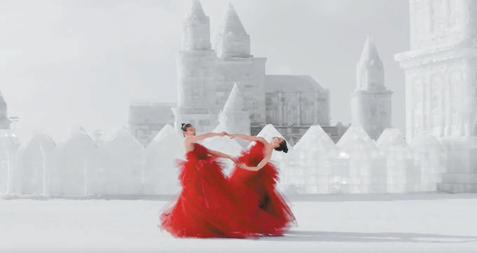 2021年,某時(shí)尚品牌的一則創(chuàng)意視頻《開(kāi)放空間》火遍網(wǎng)絡(luò)。視頻中,幾位舞者在麥田、湖泊上奔跑、飛翔、翻滾,每一位舞者如同精靈,那種逐風(fēng)的自由讓無(wú)數(shù)觀眾眼前一亮,仿佛夢(mèng)境成真。2022年,舞蹈影像導(dǎo)演李翠穎創(chuàng)作的《映雪紅珊》堪為黑龍江的絕美宣傳片。作品中,兩位身著夸張紅舞裙的舞者,在肅穆的冰雪世界中緩慢起舞,當(dāng)呼吸凝成霧氣,冰封的大地如銀河一般靜寂,兩朵“紅梅”在凜冽與寂靜中開(kāi)放,展現(xiàn)出中國(guó)極北之地的堅(jiān)韌之美。