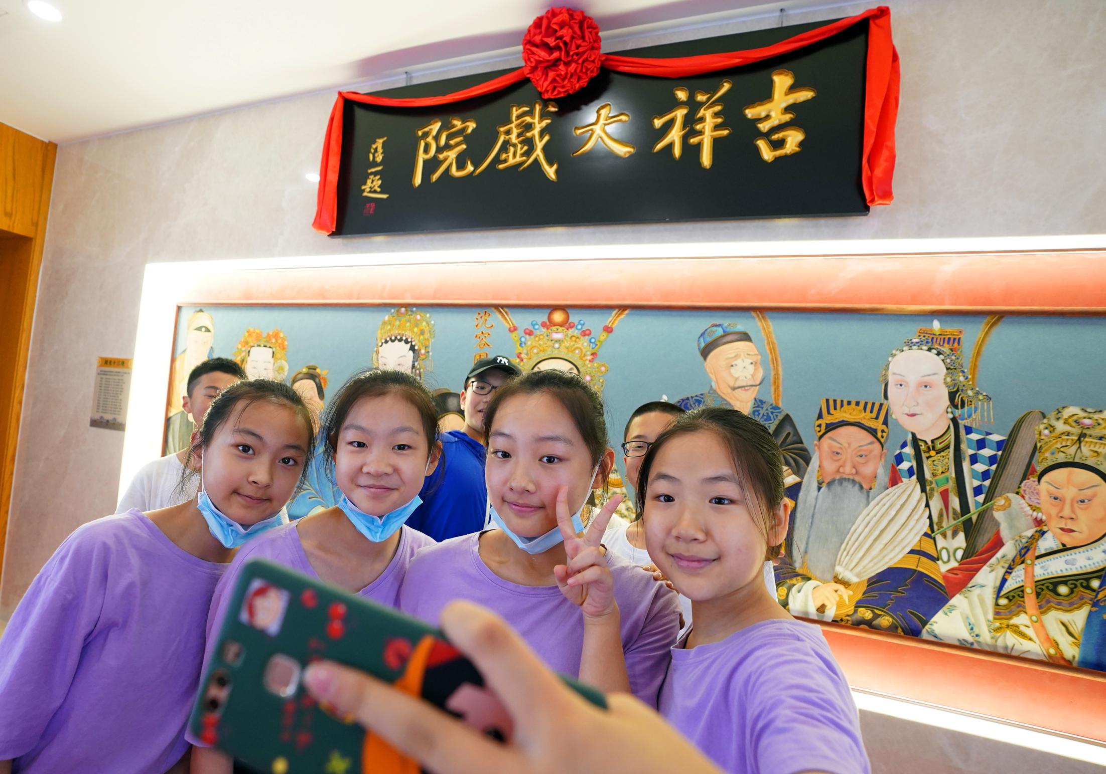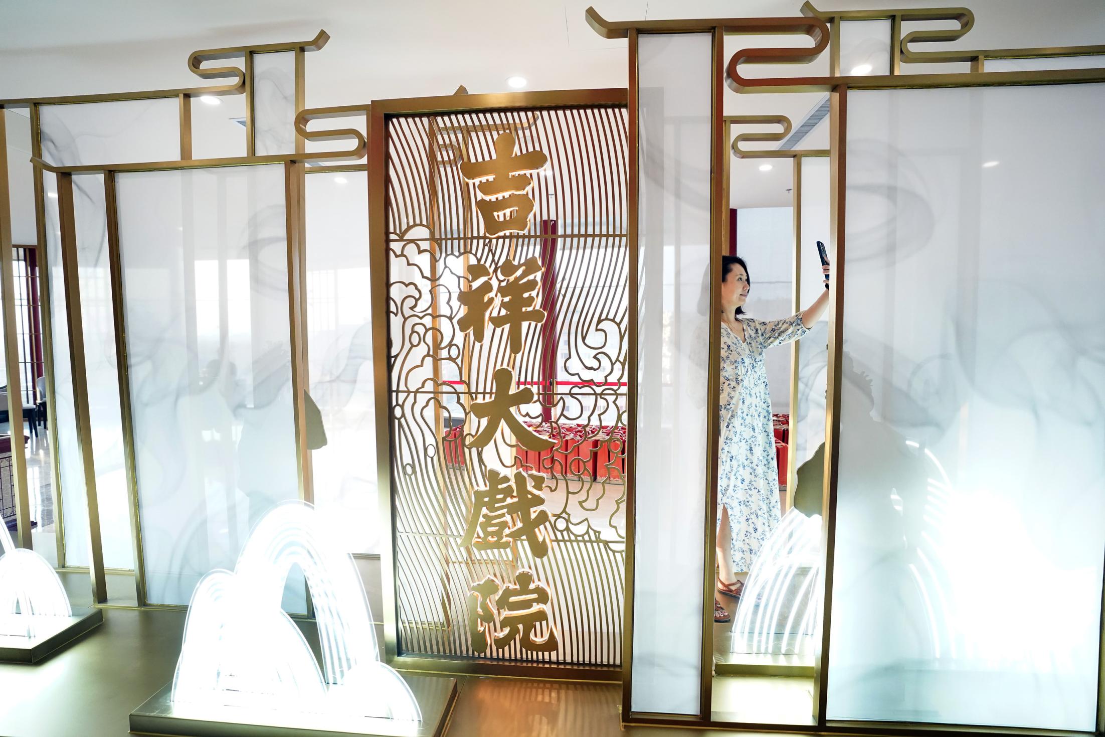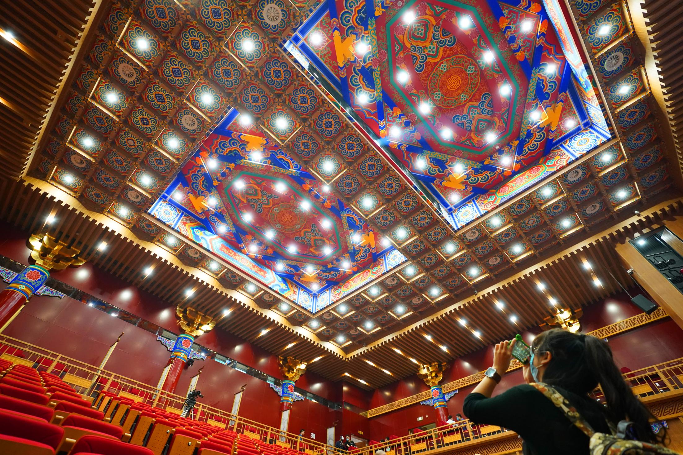 2021年7月9日,時隔28年,由北京市文化和旅游局、北京市國有資產(chǎn)經(jīng)營有限責(zé)任公司共同出資,北京京劇院、北京市演出有限責(zé)任公司共同運營的吉祥大戲院重張啟幕。這座“藏身”于銀泰in88大廈7層、8層的空中戲院占地面積達4000平方米。乘電梯上樓,初入眼簾的前廳清新雅致,落地窗外可見王府井熙攘的人群與遠處故宮、景山等古都風(fēng)光;劇場內(nèi),明清風(fēng)格古樸莊重,藻井彩繪繁復(fù)斑斕,傳統(tǒng)的“旋子彩繪”上增加了大量寓意吉祥的“萬字不到頭”圖案,與戲院的名字彼此呼應(yīng)。