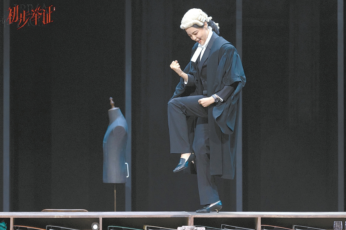 舞臺(tái)極為對(duì)稱。最醒目的,是兩側(cè)微微斜切向后景的賽馬欄。如果從上方俯視,賽馬欄將舞臺(tái)空間變成了一個(gè)等邊梯形,中央橫放著長(zhǎng)長(zhǎng)的組合式開架矮桌柜。這是由蘇西·米勒編劇、周可導(dǎo)演的獨(dú)角戲《初步舉證》中文版的現(xiàn)場(chǎng)。從大空間布局上看,中文版與2022年4月英國(guó)NTlive版有一定相似性。但舞臺(tái)布景的差異,還是顯示出導(dǎo)演不同的側(cè)重點(diǎn)。NTlive版以三面巨大的、裝滿卷宗的書柜構(gòu)成了半包圍式舞臺(tái)結(jié)構(gòu),舞臺(tái)中央是兩張大辦公桌。這一偏于寫實(shí)的布景突出了主角的律師身份,既富專業(yè)性,又有無(wú)形的壓迫感。中文版的賽馬欄則暗示庭辯仿佛賽馬,突出了律師爭(zhēng)當(dāng)“第一名”的渴望。從觀眾席望去,對(duì)稱的舞臺(tái)呈現(xiàn)出一種均衡和穩(wěn)定。演出開始后,伴隨有轉(zhuǎn)臺(tái)功能的矮桌柜的一次次旋轉(zhuǎn),主人公以她失衡的人生告訴觀眾:有些事情必須改變。