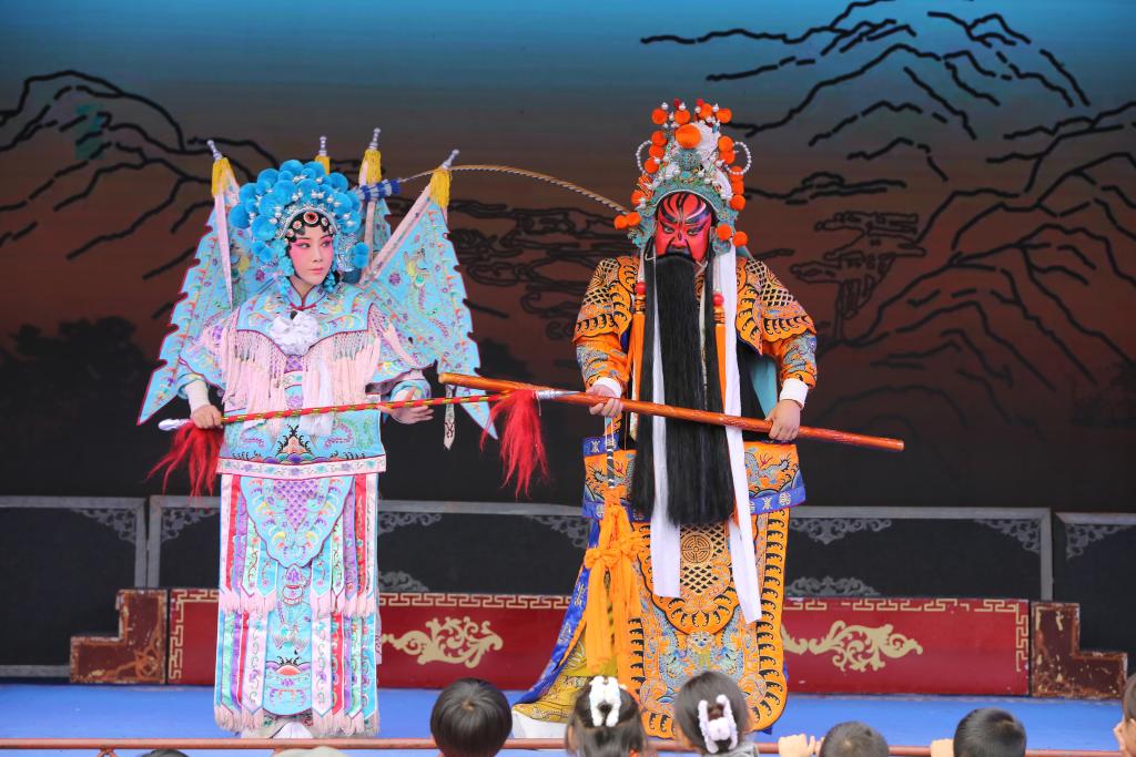 中國戲劇梅花獎(jiǎng)得主、來自寧夏秦腔劇院的國家一級(jí)演員韋小兵(右)在甘肅省定西市體育公園演唱秦腔經(jīng)典傳統(tǒng)劇《下河?xùn)|》(9月23日攝)。新華社發(fā)(王克賢攝)