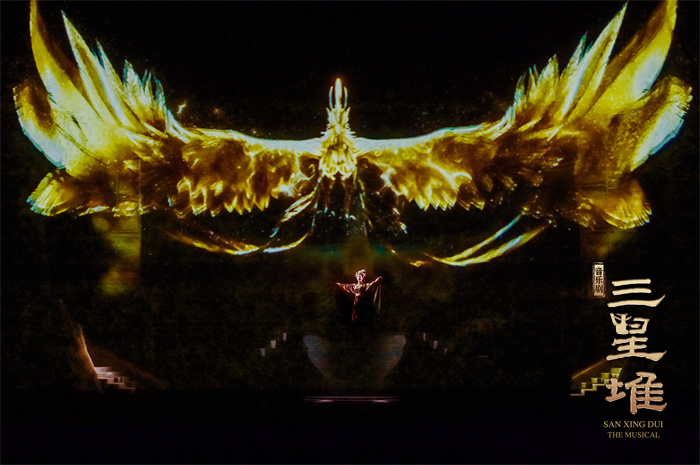 舞美設計由倫敦著名設計師摩根·拉知(Morgan Large)擔任,他曾獲2018年英國戲劇獎最佳設計獎和4次奧利弗獎、參與過《修女也瘋狂》《周日戀曲》等多部著名劇目舞美設計。舞美團隊不僅力圖在色彩和道具上還原三千年前青銅王朝的璀璨與輝煌,還通過兩百余臺電腦燈呈現(xiàn)不同場景的光影效果。觀眾將非常幸運地首次在音樂劇舞臺上,一次性看到青銅大立人、青銅大面具、青銅神樹等極具三星堆代表性文物的復刻版,加上極具沖擊力和感染力的多媒體技術(shù),生動展現(xiàn)了三千年前古蜀國的璀璨與輝煌。