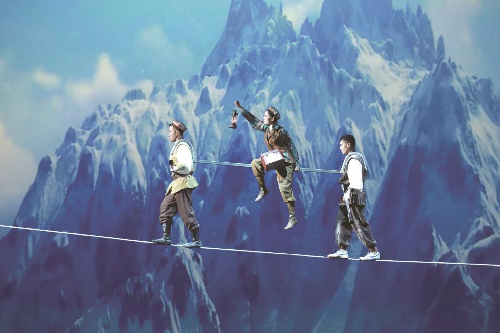 “雜技劇是雜技藝術(shù)發(fā)展非常重要的一個平臺,我們力求將人物的命運感更深切地融入雜技中?!弊蚯皟赏?,歷時三年打磨的雜技劇《天山雪》在上音歌劇院正式首演,這是海派雜技劇時隔四年后再次亮相中國上海國際藝術(shù)節(jié)?!短焐窖芬浴澳骘L(fēng)飛翔”的“雄鷹精神”作為主旨,以雜技人的故事貫穿始終,串聯(lián)起70年來新疆各族人民共同建設(shè)新疆、發(fā)展新疆的壯美歷程,用雜技藝術(shù)語匯立體講述各族人民攜手奮進(jìn)的故事。