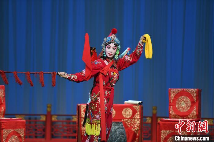 劉泳渤飾演的十三妹何玉鳳一身紅裝,身背弓刀,紅紅火火、瀟灑可愛的俠女形象,躍然于舞臺上。 中新網(wǎng)記者劉可耕攝