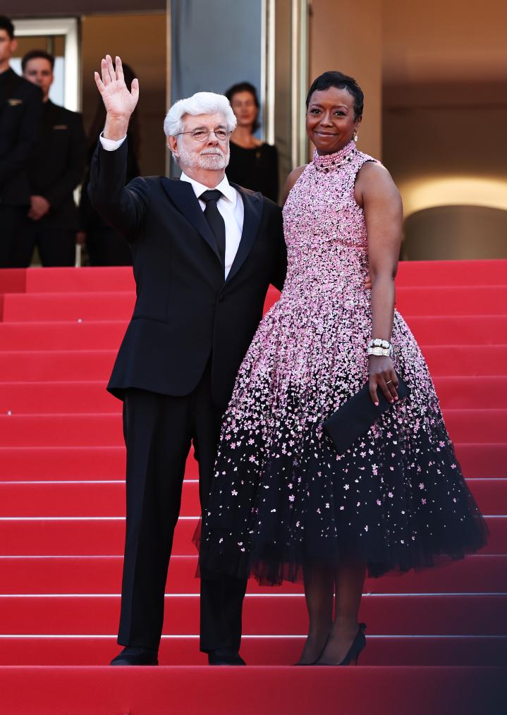 5月25日,在法國南部城市戛納舉行的第77屆戛納電影節(jié)上,美國導(dǎo)演、編劇、制片人喬治·盧卡斯(左)抵達(dá)閉幕式紅毯。新華社記者 高靜 攝