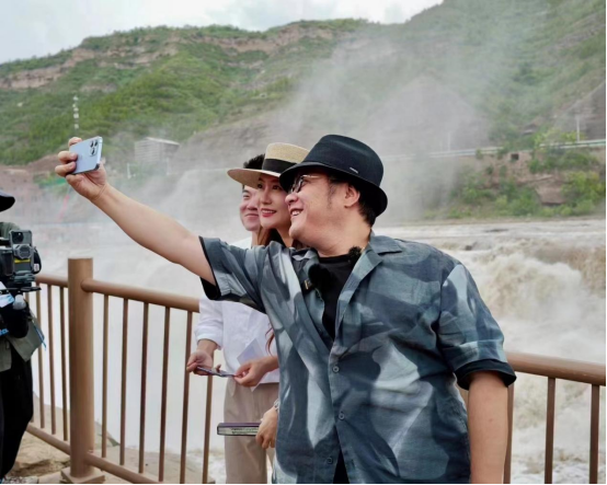6月13日,二人轉(zhuǎn)戰(zhàn)臨汾吉縣,與同樣應邀而來的導演寧浩相會于壺口瀑布,共同為家鄉(xiāng)文化代言、為山西文旅發(fā)聲。身為臨汾人,卻是第一次來到壺口瀑布,被這座有“黃河心臟”之稱的瀑布深深震撼的譚晶“秒變游客”,不停地與翻涌奔騰的黃河合影、自拍,感受家鄉(xiāng)山水的波瀾壯闊之美。