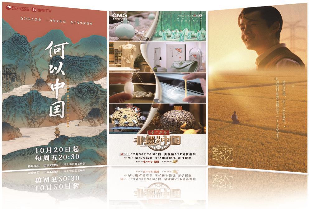 左起依次為《何以中國(guó)》《非遺里的中國(guó)》《繁花》海報(bào)。