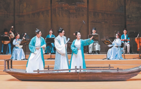 北京民族樂團玖樂室內樂組合擔任現(xiàn)場演奏,24首樂曲穿插在劇情中,訴盡人世間的離合悲歡。這些音樂作品既有傳統(tǒng)古曲,也有改編自影視音樂的當代作品片段,與劇情故事的發(fā)展嚴絲合縫地呼應。玖樂室內樂組合的成員身穿宋制服裝,坐在舞臺后方,與舞臺正中央的一葉孤舟呼應,讓《人生的盛宴》的舞臺有如古畫。民樂室內樂的現(xiàn)場演奏不僅僅是伴奏或添彩,更是劇目呈現(xiàn)不可或缺的一部分。