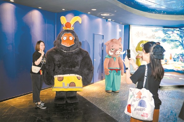 從走出軌交徐家匯站的那一刻起,“浪浪山”主題燈箱便接連映入眼簾,悄然揭開這個奇幻宇宙的序幕;美羅城商場球幕上的“小豬妖”頭像和“這條路走對了”的標語,引人駐足眺望;走進“大王洞”觀影,挑選三五周邊玩偶、精美文創(chuàng)產(chǎn)品,在360°環(huán)形劇場聽一場“浪浪山開放麥”,在“豬媽媽茶水站”來一杯飲料……這趟沉浸式體驗豐富而圓滿。