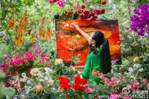 楊麗萍微博截圖 13日,舞蹈家楊麗萍在微博曬出一組自己在花園中作畫的照片。只見楊麗萍民族風(fēng)裝扮,而她所在的周圍鮮花滿布,姹紫嫣紅,還不時地有幾只鳥落在身旁,好似人間仙境。