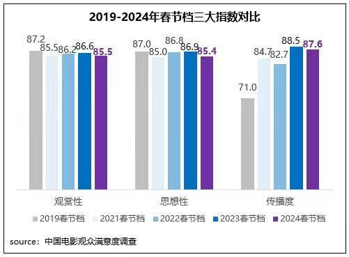 中國電影觀眾滿意度調(diào)查?2024年春節(jié)檔調(diào)查結(jié)果顯示,春節(jié)檔觀眾滿意度得分85.9分,為2015年以來調(diào)查9個春節(jié)檔的第二名,同時居歷史調(diào)查各檔期滿意度第四位。檔期調(diào)查的8部影片中有4部超85分(《飛馳人生2》86.2分、《第二十條》86.1分、《熱辣滾燙》85.9分、《熊出沒·逆轉(zhuǎn)時空》85.5分),數(shù)量和2023年同期持平,均為歷年春節(jié)檔之最。檔期多元化佳作頻出,以優(yōu)質(zhì)創(chuàng)作獲得觀眾高滿意度評價,再度掀起春節(jié)全民觀影熱潮。