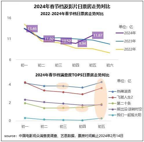 高滿意度加持下,2024年春節(jié)檔觀影及討論高潮不斷,檔期觀影人次連續(xù)六年破億,初一大盤票房再破13億元,初二初三連續(xù)保持10億+量級,并在2月14日實現(xiàn)大幅逆跌至近12億,同時檔期高滿意度影片也出現(xiàn)多次逆跌。檔期票房走勢穩(wěn)健且綜合表現(xiàn)顯現(xiàn)后勁較強(qiáng),隨著高滿意度影片的優(yōu)質(zhì)口碑持續(xù)發(fā)酵,長線票房仍具備較大增長空間。