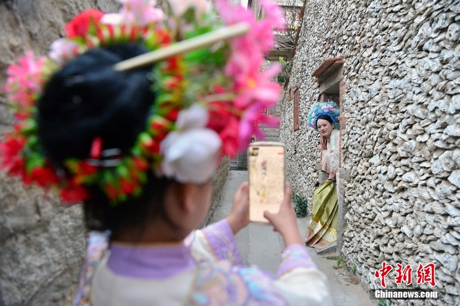 資料圖:2024年3月9日,游客在蚵殼厝前拍照。中新社記者 張斌 攝
