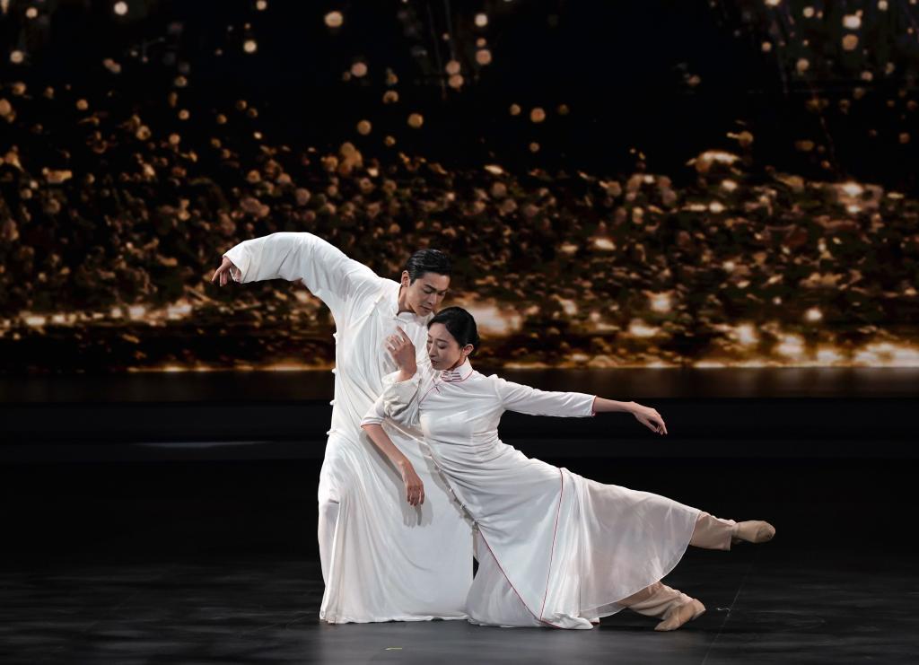 6月15日,第26屆上海國(guó)際電影節(jié)開幕影片、舞劇電影《永不消逝的電波》的演員朱潔靜(右)、王佳俊在金爵盛典上表演。新華社記者劉穎 攝