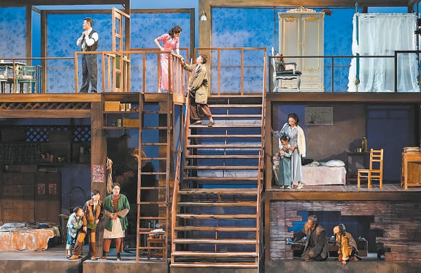 一座框架,幾個(gè)“格子間”,上海解放前夕的人間百態(tài),被裝進(jìn)舞臺(tái)上一方切面般的小天地里——75年前,電影《烏鴉與麻雀》巧妙圍繞石庫門一棟小公寓里形形色色的人們,對國民黨統(tǒng)治狀況進(jìn)行了入木三分的批判。經(jīng)典作品的力量歷久彌新,昨日,國家大劇院制作話劇《烏鴉與麻雀》迎來首演,在當(dāng)代戲劇舞臺(tái)上,老電影煥新醒來。