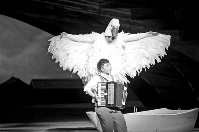 最具情趣的莫過于由北京京劇院武丑演員曹陽陽帶領(lǐng)一眾北戲?qū)W生演出的大鵝,身披潔白羽毛憨態(tài)可掬。這也是曹陽陽從藝以來第一次在舞臺上以動(dòng)物的形態(tài)進(jìn)行表演。這個(gè)與主角林大林互動(dòng)最多的角色,既要化身林大林渴望的父愛,又是他孤單時(shí)的玩伴。在模仿大鵝走路的過程中,曹陽陽便用上了京劇武丑的技巧。其中一場水中救人的段落,他甚至還要從兩米多高的橋上展開翅膀飛身下去,對京劇下高、空翻技巧有了全新的展示。