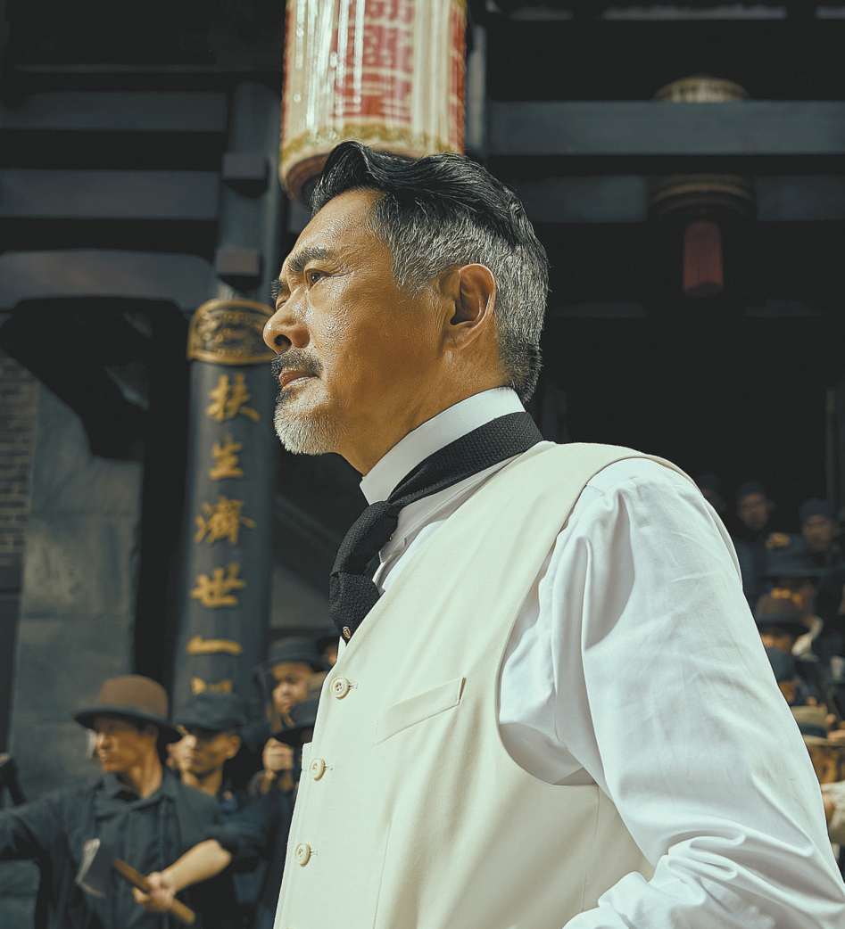 可以說(shuō)《唐探1900》真正的主角,這次不是兩位偵探,而是白軒齡、白振邦父子,他們的經(jīng)歷和立場(chǎng)在早期第一、第二代華人移民中具有代表性。周潤(rùn)發(fā)飾演的白軒齡作為最早到舊金山的淘金者、修建太平洋鐵路的幸存者,可謂華工血淚史的書(shū)寫(xiě)者和見(jiàn)證者。同時(shí)他又是復(fù)雜的,既有手腕又長(zhǎng)袖善舞,黑白通吃,通過(guò)暴力和權(quán)錢交易自保,但也讓唐人街藏污納垢,連親兒子都難以忍受。而從他給兒子起名“振邦”來(lái)看,白軒齡內(nèi)心也希望祖國(guó)一掃積貧積弱,海外僑民才能挺直腰桿,但他又不愿付出“拋頭顱灑熱血”的犧牲,只能深陷一種矛盾平衡之中。而白振邦(張新成 飾)、鄭仕良(白客 飾)等年輕一代,則選擇一腔熱血奔赴革命,同《十月圍城》《走向共和》里那樣“一代人去做一代人的事情”,成為全片最令人欽佩和振奮的群體。