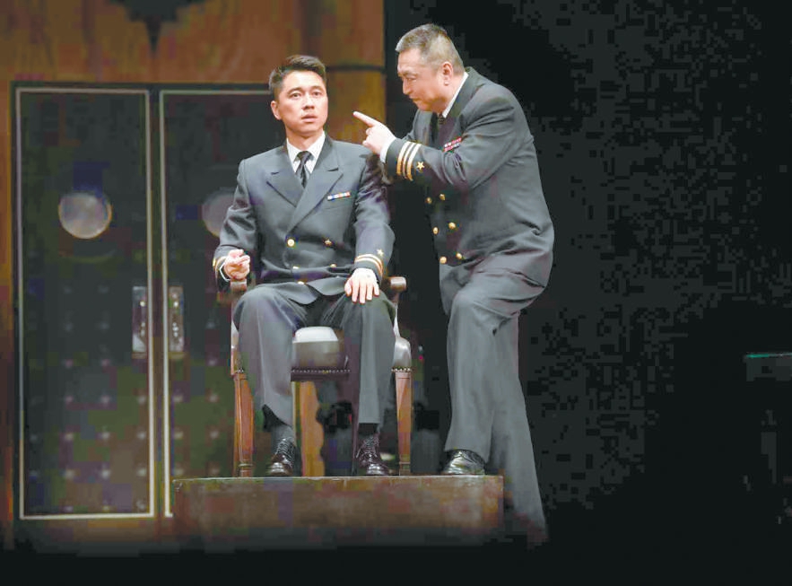 于觀眾而言,戲骨飆戲是《嘩變》格外精彩的看點(diǎn),無(wú)論是制造了“草莓事件”“黃色燃料事件”“電咖啡壺事件”等一系列“鬧劇”的艦長(zhǎng)魁格、以“詭計(jì)”掌控全場(chǎng)節(jié)奏的律師格林渥,還是圖窮匕見(jiàn)、老謀深算的基弗,抑或每一個(gè)各懷目的、性格鮮明的角色,他們之間起伏有致的銜接是對(duì)演員表演功底的極大考驗(yàn)。飾演魁格的馮遠(yuǎn)征把《嘩變》總結(jié)為一場(chǎng)“坐著把戲演好”的挑戰(zhàn),全劇除了格林渥與檢察官可以走動(dòng),其他所有人幾乎坐著演完全程,如何把臺(tái)詞說(shuō)得詳細(xì)、說(shuō)得抓人,同時(shí)靠說(shuō)就把角色塑造到位,是演員需要日日精進(jìn)的功課,也是觀眾愿意一再為之奔赴而來(lái)的重要理由。