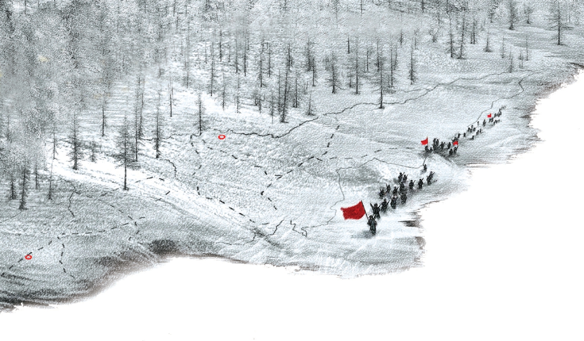 每年很長(zhǎng)時(shí)間,這里的氣候不適合室外生存,冬季氣溫更低至零下三四十度,有人的耳朵、手指、腳趾甚至?xí)粌龅?。日軍將?dāng)?shù)卮迕駨?qiáng)制集中居住,抗聯(lián)得不到食物、衣服等。正如《歸隊(duì)》中所呈現(xiàn)出來的那樣:戰(zhàn)士們輕易不能生火取暖,深可沒腰的積雪限制了我方移動(dòng),行蹤又很容易被發(fā)現(xiàn)——敵人會(huì)沿著雪地上的腳印,進(jìn)行追擊。