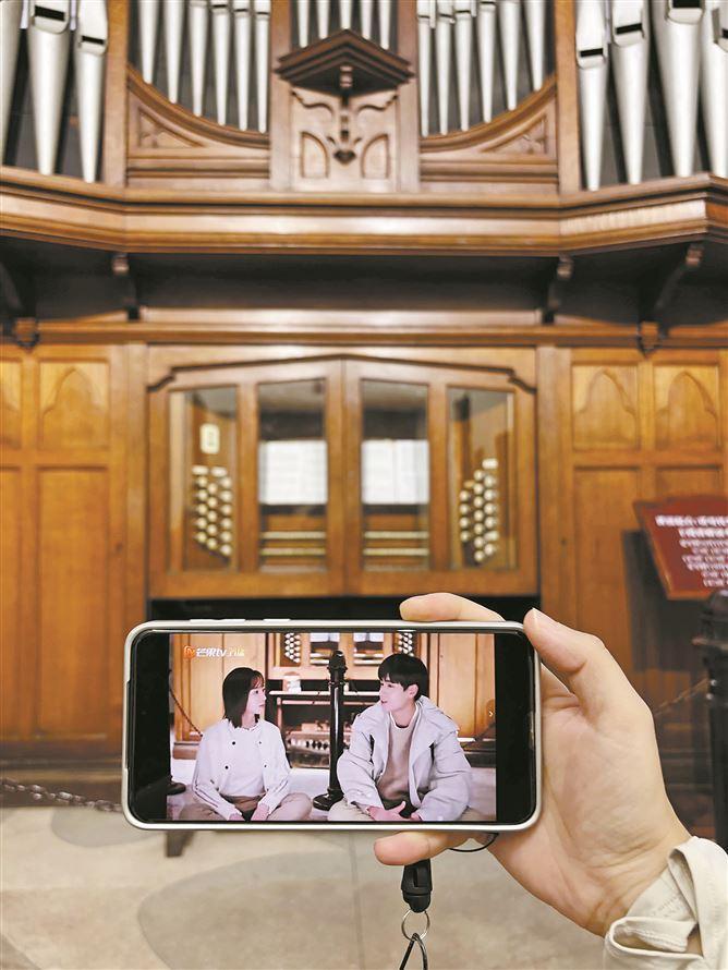 來鼓浪嶼打卡的游客將劇照和現場對比,拍照留念。