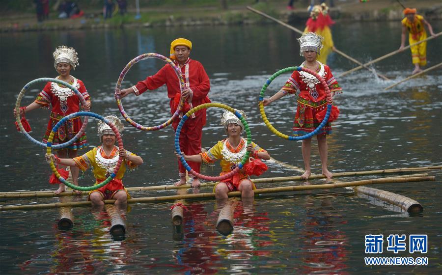 1月1日,“獨竹漂”愛好者在花溪河上表演水上高難度平衡動作。 2016年元旦,在貴陽市花溪公園平橋河段舉行的貴陽市第31屆冬泳表演活動中,數(shù)十名“獨竹漂”愛好者在花溪河上腳踏漂浮的竹竿,表演“金雞獨立”、轉(zhuǎn)身平衡等高難度動作,讓觀眾大飽眼福。新華社發(fā)(秦剛 攝)