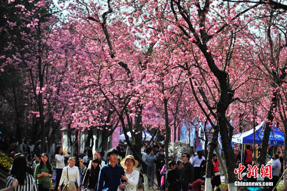 近日,昆明圓通山的櫻花和海棠花逐漸進入盛花期,引來眾多市民踏春趕花潮。圓通山工作人員介紹,受此前寒潮的影響,海棠和櫻花花期推遲,但顏色比往年更艷麗且花量增加。中新社記者 劉冉陽 攝