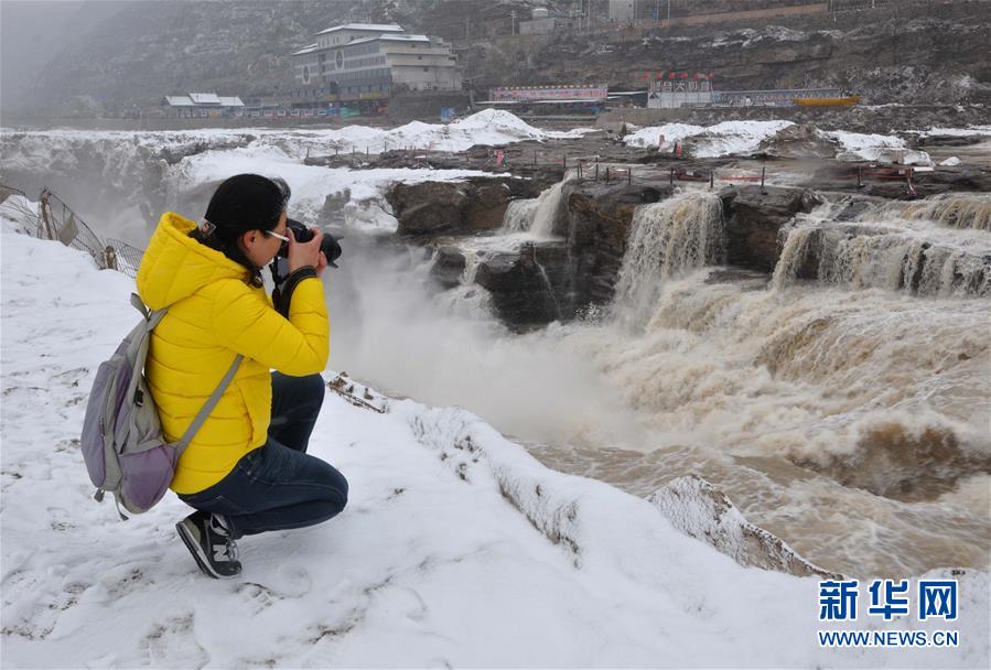 3月9日,一名游客在山西吉縣拍攝飛雪中的黃河壺口瀑布。當(dāng)日,受倒春寒天氣影響,位于山西吉縣和陜西宜川縣交界的黃河壺口瀑布迎來(lái)雨雪天氣,奔流的壺口瀑布在白雪的映襯下更顯壯美。新華社發(fā)(呂桂明 攝)