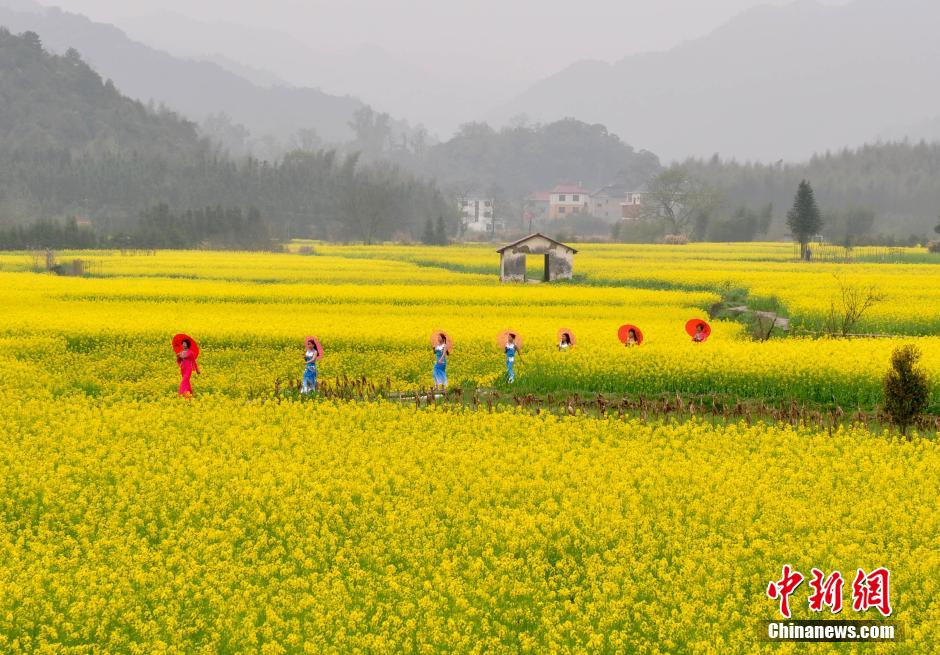 3月20日,江西省德興市??阪?zhèn)杜村婦女在田間花?!白咝恪薄.斎?,江西德興市??阪?zhèn)杜村一批家庭婦女以千畝油菜花海為舞臺,展示自己的才藝形象,希望宣傳家鄉(xiāng)的自然生態(tài)與人文歷史,擴大旅游知名度和影響力。德興市??阪?zhèn)杜村交通便利,自然風光優(yōu)美,村內有歷史古跡和名木古樹。 胡敦煌 攝