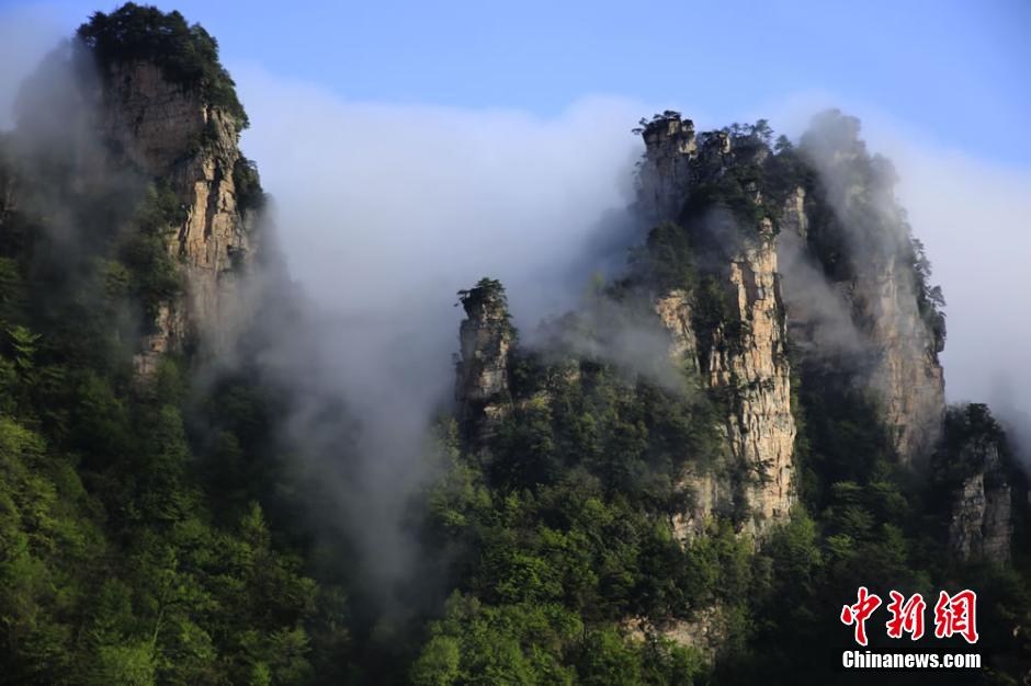 4月18日,雨過天晴的湖南張家界核心景區(qū)武陵源出現(xiàn)壯觀的“云瀑”景觀。雪白的濃云從峰林間向下翻騰,猶如天河傾瀉,氣勢(shì)磅礴。 吳勇兵 攝