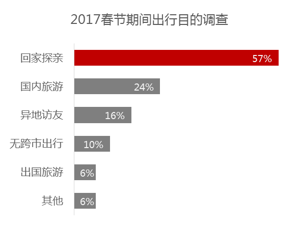 《報告》關(guān)于2017年春節(jié)跨市出行(長途出行)意愿的在線問卷調(diào)查數(shù)據(jù)顯示,“回家探親”是受訪者春節(jié)期間長途出行的第一大動機,“國內(nèi)旅游”則是第二大出行動機。總體而言,受訪者能夠明確給出的春節(jié)出行動機中,除了“回家探親”,就是旅游(國內(nèi)游和出境游)。這表明,居民2017年春節(jié)期間的旅游消費意愿強烈,旅游過年已經(jīng)成為較為主流的過年方式。