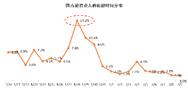 出游時間方面,春節(jié)國內(nèi)長線游者選擇節(jié)前錯峰游的占比38.3%,春節(jié)黃金周期間出游的占比47.2%,1月28日(正月初一)達到客流峰值,選擇節(jié)后錯峰出游的僅占比14.5%。