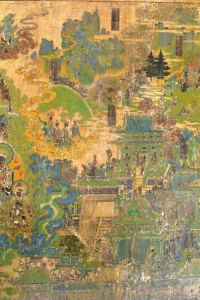 但巖山寺金代壁畫有確切年代,是御前承應(yīng)畫匠王逵用10年時間才完成這一煌煌巨制。800多年前,王逵面對四壁,決然舍棄慣常的連環(huán)畫形式,大膽?yīng)殑?chuàng),采用滿幅構(gòu)圖形式,以一組繁雜的宮廷建筑為中心,配以各種故事情節(jié)畫面,然后用山水、樹石、云嵐連結(jié),細(xì)部真實,透視準(zhǔn)確,遠(yuǎn)看儼然一幅氣勢磅礴的大型山水畫,近瞧卻又章回分明。壁畫上就有多處使用瀝粉堆金裝飾,顯現(xiàn)金碧輝煌、富麗非凡的效果。這樣大面積的工筆重彩畫,一絲不茍,找不到起稿與粉本痕跡,而且線條變化多樣,無一廢筆,令人驚嘆。