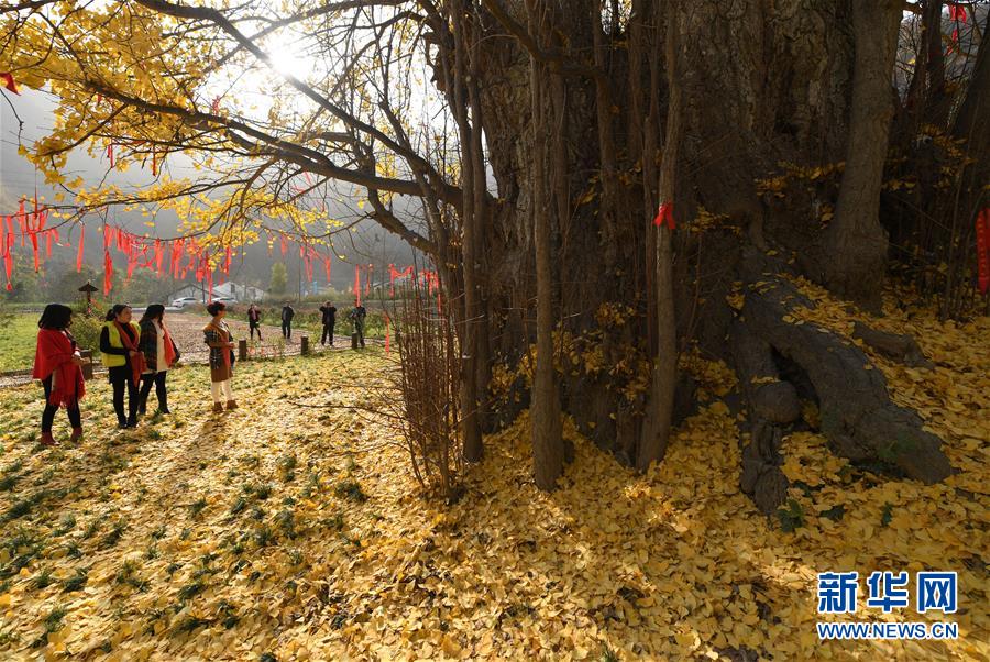 11月19日,游客在留壩縣玉皇廟鎮(zhèn)參觀千年銀杏樹(shù)。初冬時(shí)節(jié),在秦嶺深處的陜西省留壩縣玉皇廟鎮(zhèn)石窯壩村,一棵千年古銀杏樹(shù)的落葉宛如金色地毯,甚為壯觀。據(jù)當(dāng)?shù)亓謽I(yè)部門(mén)介紹,該樹(shù)胸徑為4.45米,現(xiàn)有高度29米。新華社記者 陶明 攝