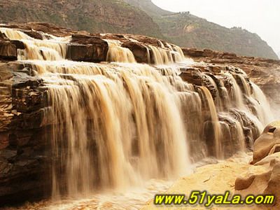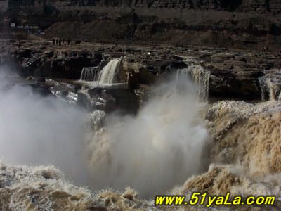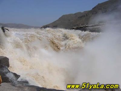 壺口瀑布位于吉縣城西45公里、距臨汾市165公里處的晉陜峽谷黃河河床中,為世界上最大的黃色瀑布,因其氣勢雄渾而享譽中外。此地兩岸夾山,河底石巖上沖刷成一巨溝,寬達(dá)30米,深約50米,滾滾黃水奔流至此,倒懸傾注,若奔馬直入河溝,波浪翻滾,驚濤怒吼,震聲數(shù)里可聞。其形如巨壺沸騰,故名。黃河浪濤激起一團團霧煙云隨著水霧的升高,煙云由黃變灰、由灰變藍(lán),景色奇麗,有“水底生煙”之說。壺口瀑布不僅有“水底冒煙”,“彩橋通天”奇景,更有“旱地行船”之說。上游船只到此,必須離水登陸,經(jīng)人抬或車運繞過壺口(即所謂“旱地行船”)方可入水續(xù)航,千百年來,概莫能變。