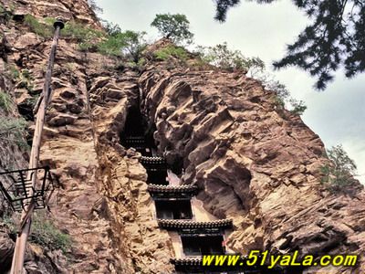 北洞是主體建筑部分。中區(qū)有大殿三間,座北向南。原為道教三清塑像,后被佛教改成三世佛。左右耳殿,另有東西配殿各三間,南閣一間。東側(cè)迎面山壁上,自然形成龐大的三角形石縫,內(nèi)有天然石洞,景觀奇特。石縫上端,外建五層樓閣。依崖開鑿卯洞,梁架結(jié)構(gòu)與崖石交接構(gòu)筑,建造精巧。閣內(nèi)設(shè)有鐵索,扶鐵索可攀援而上。在閣的東邊又有一洞,內(nèi)建殿三間,名九仙女閣,塑九仙女像。箭閣外塑趙杲泥像,頭頂距石崖僅二指半,故舊稱“趙杲觀,離天二指半”。再往南,就是趙杲觀最險峻的景觀了。峭峰高處,半山腰中,山洞前面,建樓三間。一眼望去,高閣懸空,上峭崖,下絕壁,左右山石如刀削。上下左右根本無路可通。山洞中垂下一條長約20米的鐵索,成了進(jìn)洞的唯一途徑。只有勇敢的虔誠者或探險者,方可垂直攀索而登,一般人只能望樓興嘆,故鐵索被譽(yù)為“仙閣云梯”。三層樓建筑后依山洞,前為磚木結(jié)構(gòu)。上層內(nèi)塑太上老君、無始天尊、通天教主。中層內(nèi)塑關(guān)圣帝君。下層供修持者居住。當(dāng)時修筑情景,真令人難以想像。北洞群落,地形險要,峰巒競秀,古木參天,峭峻幽邃,設(shè)計(jì)大膽,造型奇特。人夸“雁北懸空寺,不及代州趙杲現(xiàn)”說的并不過分。